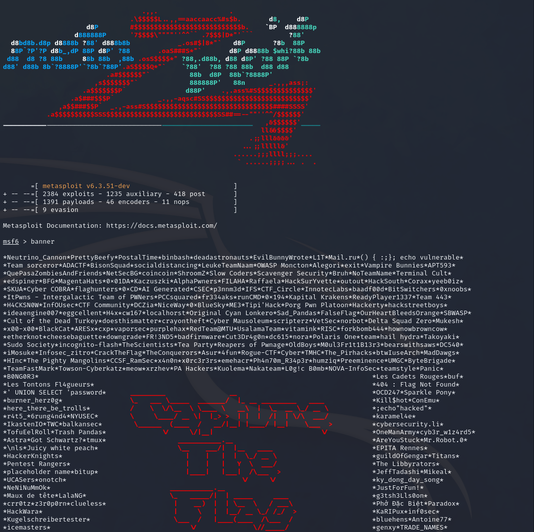 + -- --=[ 2384 exploits - 1235 auxiliary - 418 post ]
