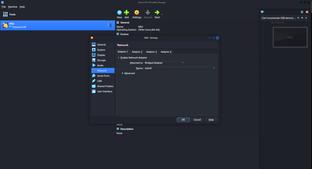 - Choose “Bridge Adapter” from the drop down on the “Attached To“