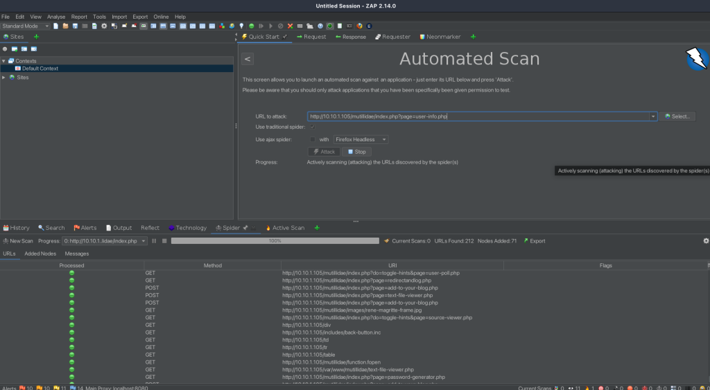 Upon targeting this URL, we will initiate an automated scan using ZAP. This process involves two crucial stages: Spidering and Active Scanning.