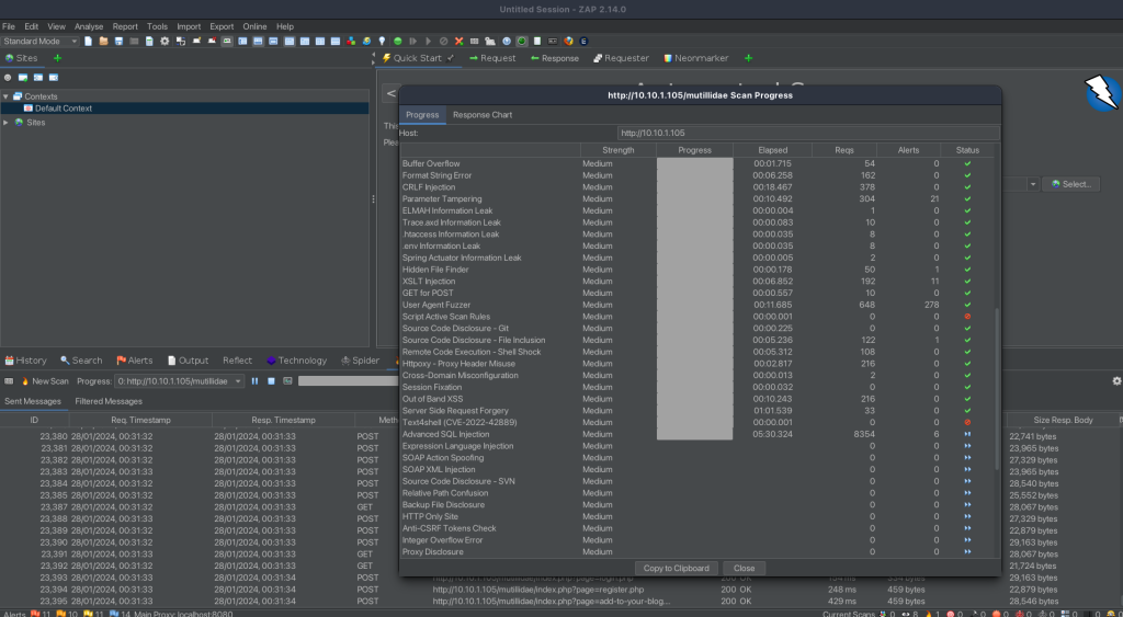 In our endeavour to analyse the vulnerabilities of the Mutillidae application on Metasploitable2, we have engaged ZAP’s automated active scanning feature. This comprehensive and robust tool goes through an extensive list of tests to uncover potential security issues. Below is a detailed overview of the active scanning process we conducted, showcasing the breadth and depth of ZAP’s capabilities in identifying vulnerabilities.