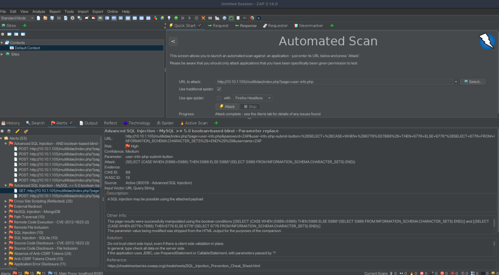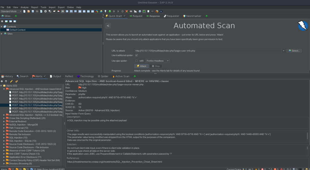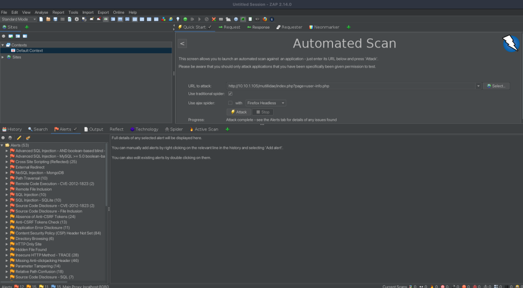 As we embark on this automated scanning process, we anticipate uncovering a range of vulnerabilities within the Mutillidae application. This exercise will not only highlight the strengths of ZAP as a security tool but also provide practical insights into the nature and identification of common web application vulnerabilities.