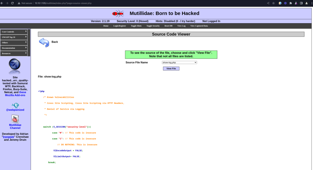 The evidence of this vulnerability was discovered upon inputting the URL http://10.10.1.105/mutillidae/index.php?page=source-viewer.php. This action allowed us to view the source code of the show-log.php file. The source code revealed several indicators of vulnerability: