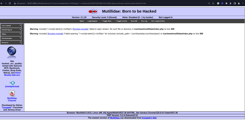 Warning: include("><scrIpt>alert(1);</scRipt>) [function.include]: failed to open stream: No such file or directory in /var/www/mutillidae/index.php on line 469Warning: include() [function.include]: Failed opening '"><scrIpt>alert(1);</scRipt>' for inclusion (include_path='.:/usr/share/php:/usr/share/pear') in /var/www/mutillidae/index.php on line 469