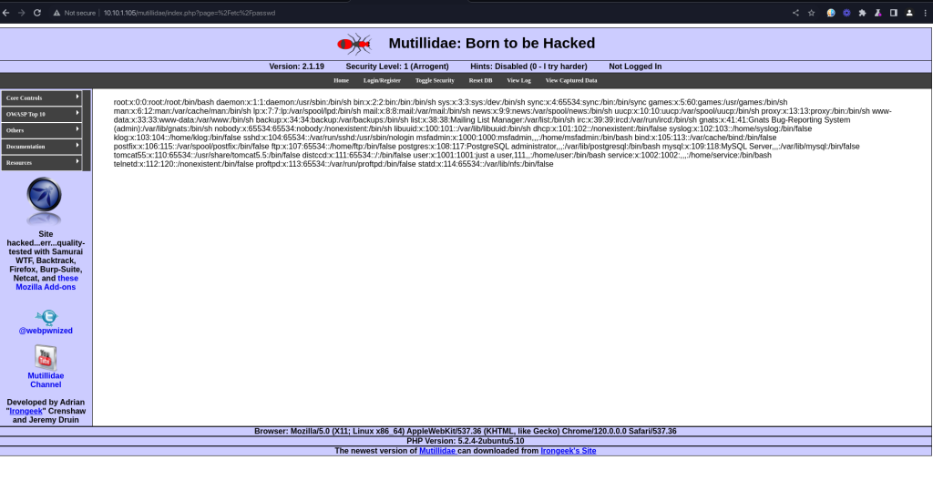 The vulnerability was identified through the URL: http://10.10.1.105/mutillidae/index.php?do=toggle-security&page=%2Fetc%2Fpasswd. By manipulating the page parameter in the query string, the attacker is able to traverse out of the intended directory and access the /etc/passwd file, a critical system file in Unix-like operating systems.