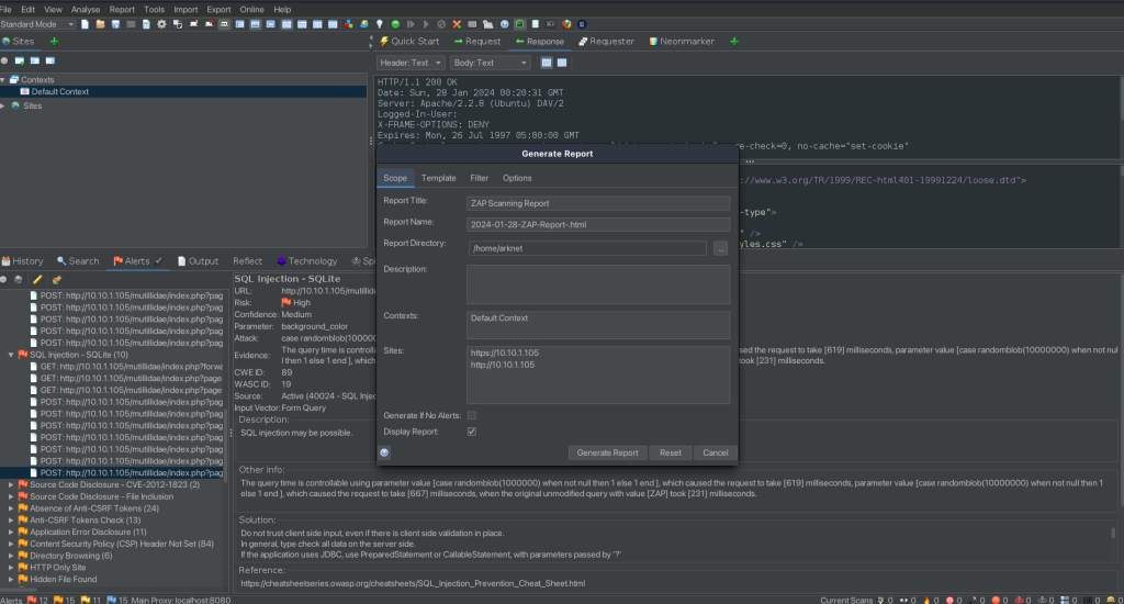 In summary, the results from our ZAP scan on Mutillidae are a starting point. They provide valuable insights but should not be taken at face value without manual verification. This two-pronged approach of using automated tools supplemented by manual testing forms the backbone of a robust and effective web application security assessment strategy.